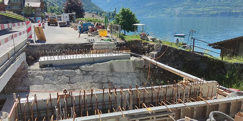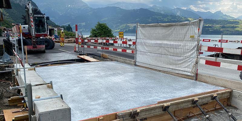 Vollständiger, etappierter Rückbau der bestehenden Brücke und Ersatz durch eine Betonkonstruktion. Die Bordüren wurden im Werkhof vorfabriziert.