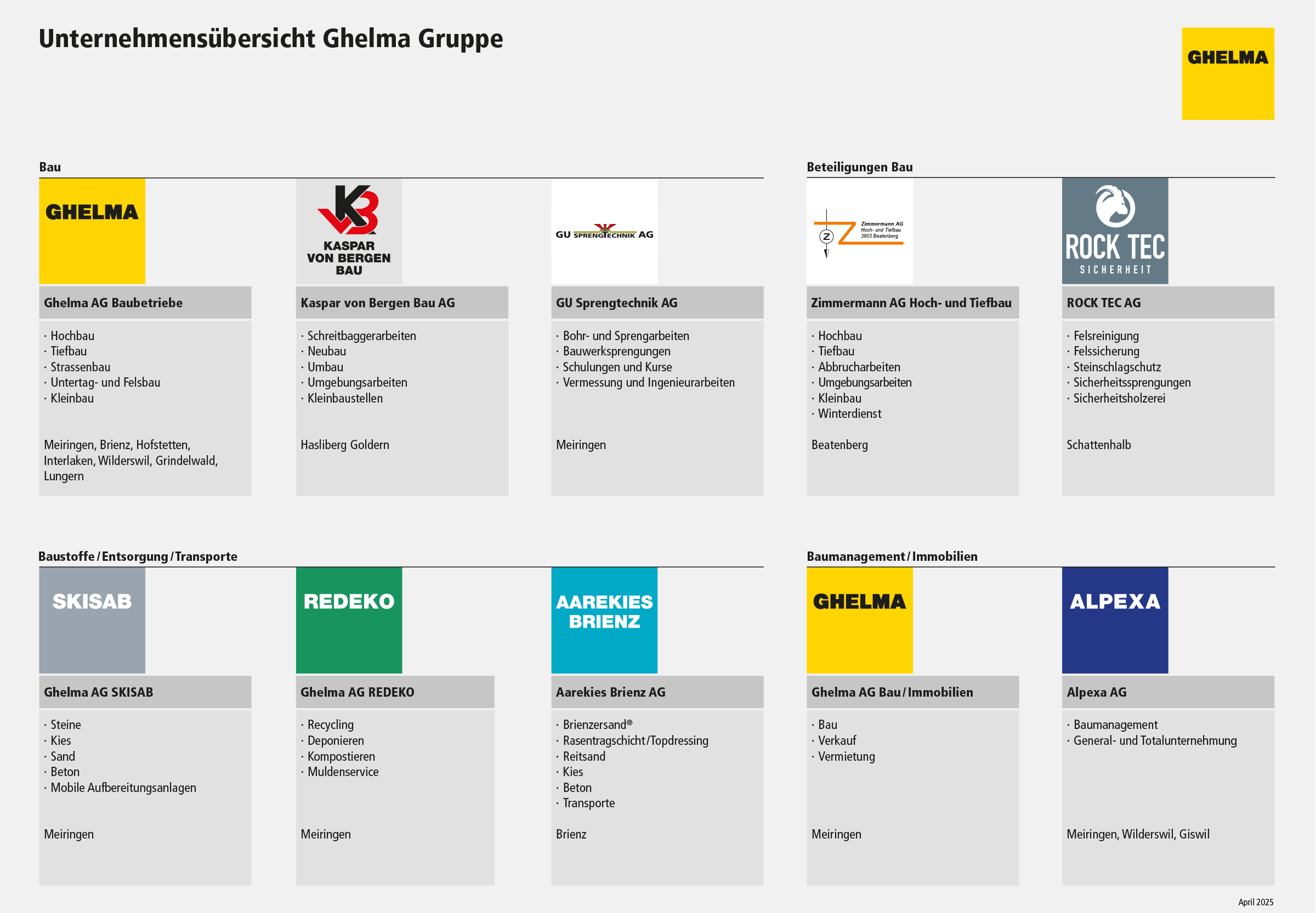 Seit Anfang 2025 ist die GU Sprengtechnik AG Teil der Ghelma Gruppe. Die Firma ist bekannt für ihr grosses Know-how in Bauwerksprengungen. Ebenso bietet sie allgemeine Bohr- und Sprengarbeiten, Steinbruchbewirtschaftung, Ingenieur- und Erschütterungsmessungen sowie Beratungen und Expertisen an.
